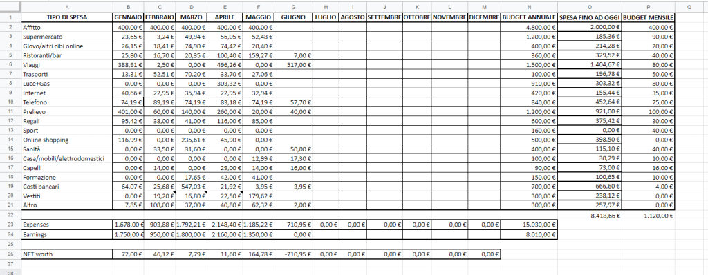 For example: On June 10, 2022, I decided to start tracking my expenses to avoid waste. I logged into my bank’s website and, under the transaction history section, I found all the transactions that occurred from January 1, 2022, to June 10, 2022. I then set up a Google Sheet where I listed the types of expenses in the rows (e.g., coffee shop, restaurant, entertainment, shopping, etc.), and the months in the columns. The next step was to enter how much I spent each month under the corresponding category. Once this was done (it took me about two hours since I had already prepared the file beforehand), I had a clear monthly breakdown for each expense category. At this point, identifying unnecessary expenses and waste was incredibly easy. Once you reach this stage (referred to as “Money Awareness”), cutting the superfluous and choosing to forgo certain expenses becomes a purely subjective and personal decision. However, the awareness this exercise provides offers a benefit that has no monetary value: the power of choice. [My advice is always to make sure you feel comfortable; there’s no point in cutting out the TV, computer, and other items to be financially satisfied but personally unfulfilled—the challenge is finding a balance between what you need to feel good and what you can eliminate without too much discomfort.] Once you have prepared your expense tracking sheet, you will see a clear monthly amount that, after eliminating the superfluous, is needed to live a balanced life (calculate the average total monthly expense). This will be your reference budget. You have just created a BUDGETING plan, which you will need to adhere to almost scrupulously if you want tangible results (at least for the first few months, to allow your mind and lifestyle to get used to the idea of having a limit that didn’t exist before). Here’s an example: